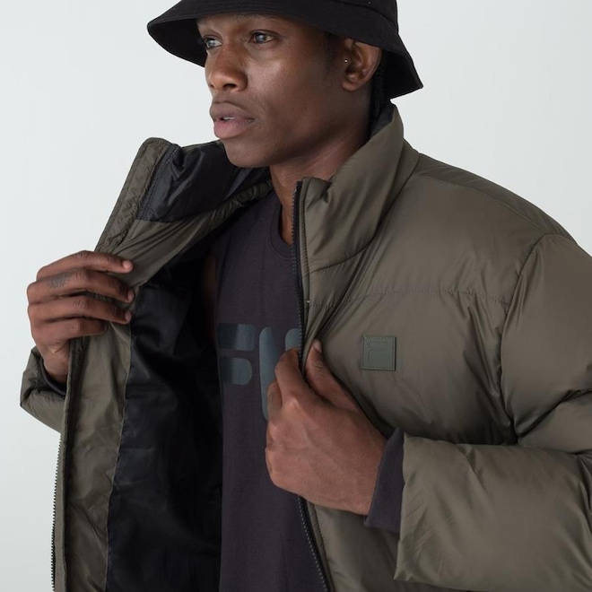 Jaqueta masculina confeccionada em matelassê de poliéster. Modelagem puffer, que proporciona isolamento térmico, com manga longa e gola alta. Possui abertura frontal em zíper com puxador personalizado F-Box, cavas deslocadas, punhos em ribana, bolsos frontais invisíveis embutidos no padding com fechamento em zíper, ajuste interno nas laterais da barra com elástico rolete e stopper e patch F-Box surton emborrachado aplicado na parte frontal esquerda superior.ref: M0ZWF3