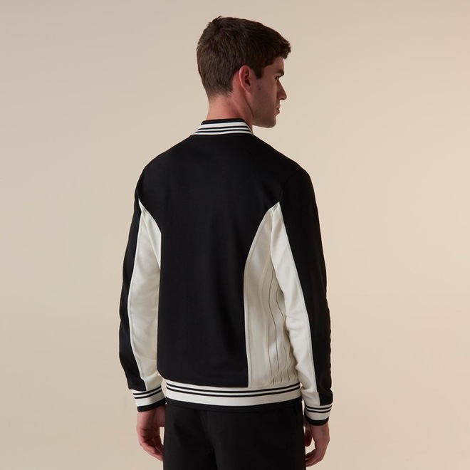 Jaqueta masculina confeccionada em composição de poliéster e algodão. A modelagem regular, estilo Settanta, apresenta recortes contrastantes nas laterais e abaixo das mangas. Possui zíper com puxador F-Box, além de gola, barra e punhos em retilínea. A assinatura da marca é feita pelo patch F-Box aplicado na parte frontal.