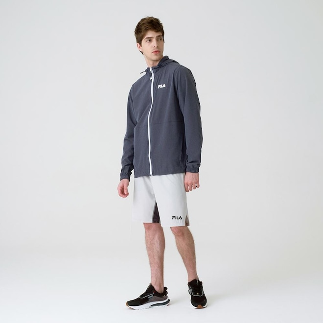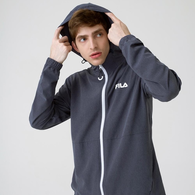 Jaqueta masculina confeccionada em tecido plano de poliéster com elastano. Modelagem regular com capuz e manga longa. Possui abertura frontal em zíper com puxador personalizado, bolsos laterais acompanhando as costuras deslocadas para frente, punho tombado com elástico interno, capuz com elástico interno regulável, barra traseira arredondada com comprimento maior que a barra frontal e logo Fila Letter em relevo aplicado na parte frontal esquerda superior. MARINHO MESCLA