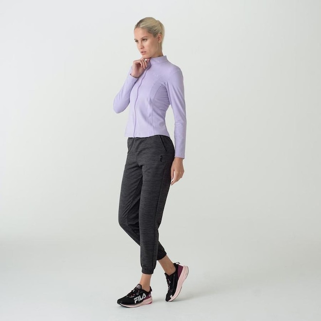 Jaqueta feminina confeccionada em viscose com elastano. Modelagem regular com queda de ombro, manga longa e gola alta. Possui abertura frontal em zíper personalizado com capinha, laterais deslocadas para maior conforto e mobilidade, cavas recortadas, costuras dos recortes sem atrito com o corpo e logos Fila Letter em termo aplicados na parte frontal esquerda superior e centralizado na parte traseira próximo à gola.