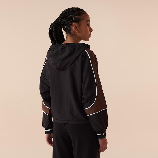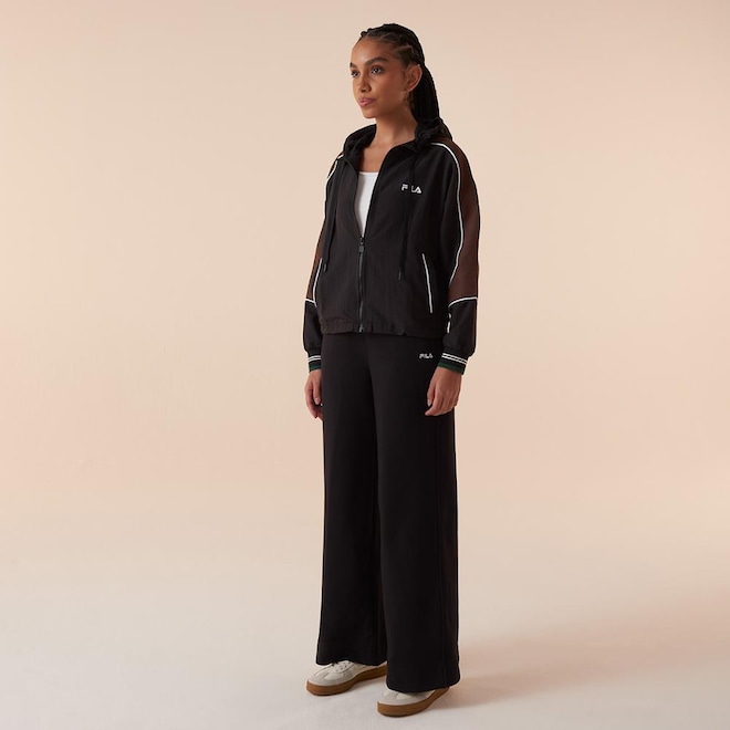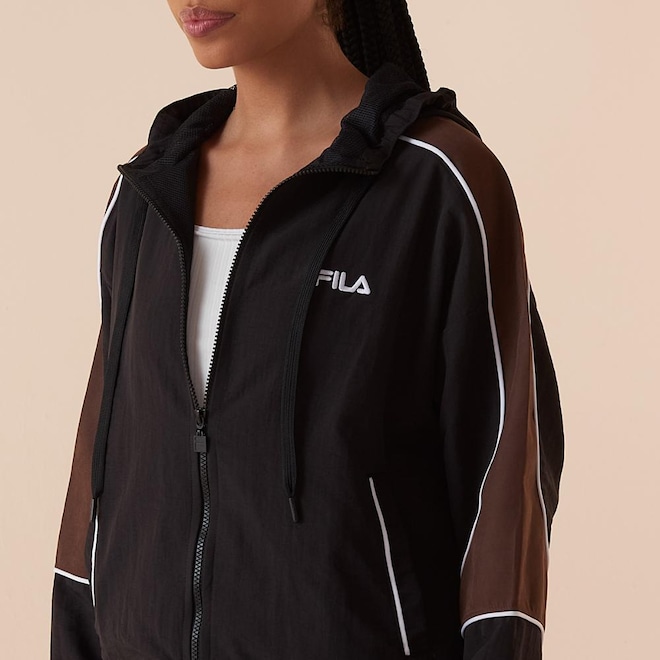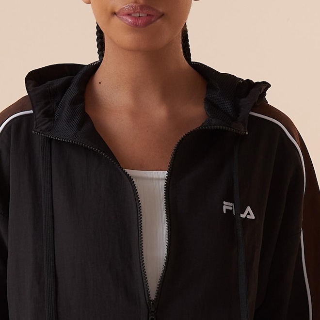 - Sobre o produto Jaqueta feminina com capuz em tecido de poliamida, modelagem comfort, gola alta e manga longa. Com tecnologias FLOW para secagem rápida e UV PROTECTION FPS 50+, possui zíper tratorado com puxador F-Box, forro em mesh respirável, bolsos frontais, punhos em retilínea listrada e barra ajustável com stopper. Detalhes incluem vivos pespontados nas mangas e logo FILA Letter bicolor bordado no peito. Ideal para esporte e proteção.- ref: M17M2I