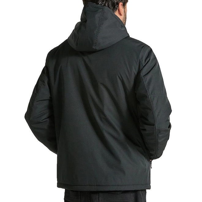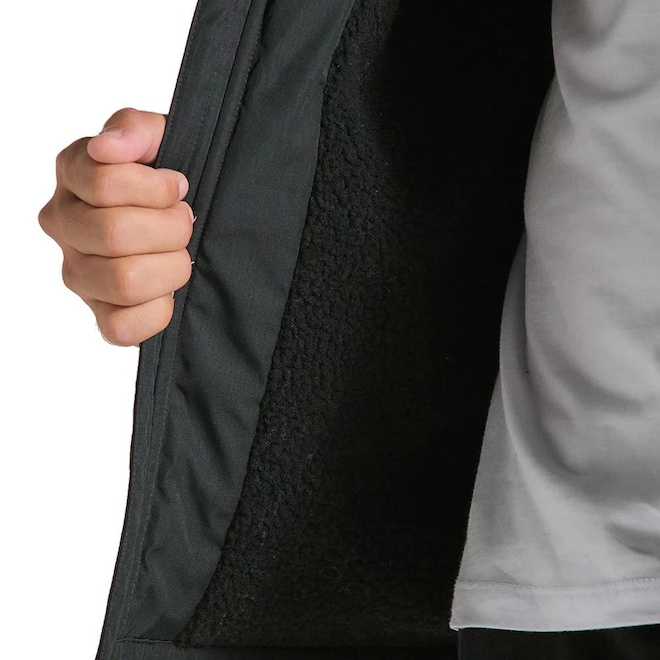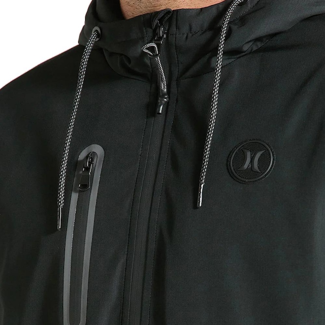 Jaqueta Hurley com forro de sherpa, capuz com gola alta, patch ICON 3D de borracha, bolsos frontais com zíper e bolso no peito com borda refletiva.