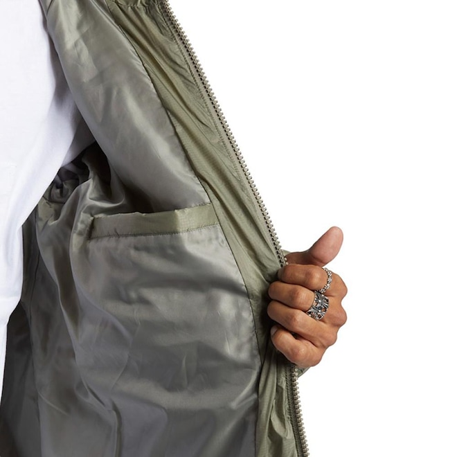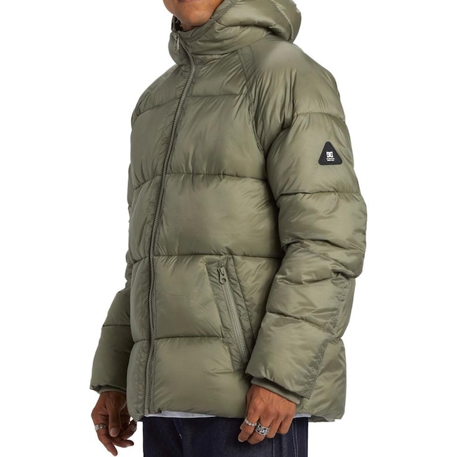 Jaqueta Dc Shoes com tecido de ripstop leve repelente à água, capuz com ótima proteção para o pescoço, punhos canelados com ótimo fechamento, matelassê horizontal, preenchimento de manta acrílica grossa, forro de cetim, bolsos embutidos com fechamento de zíper, fechamento com zíper tratorado e patch emborrachado no braço.