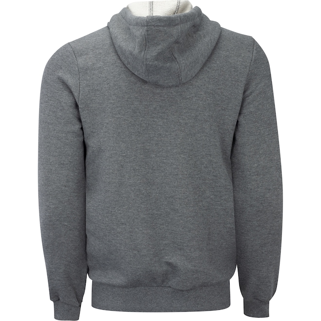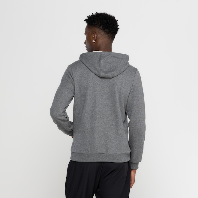 Possui fechamento em zíper, dois bolsos frontais e capuz com ajuste em cordão.