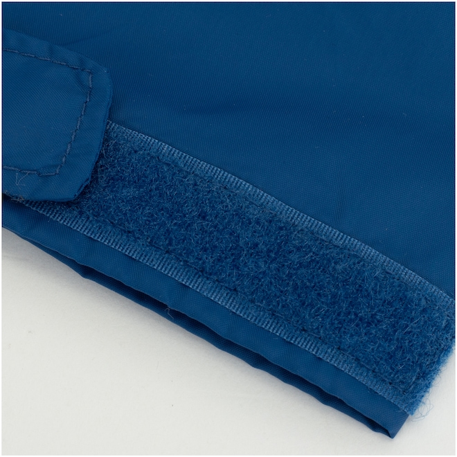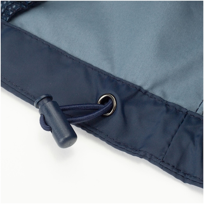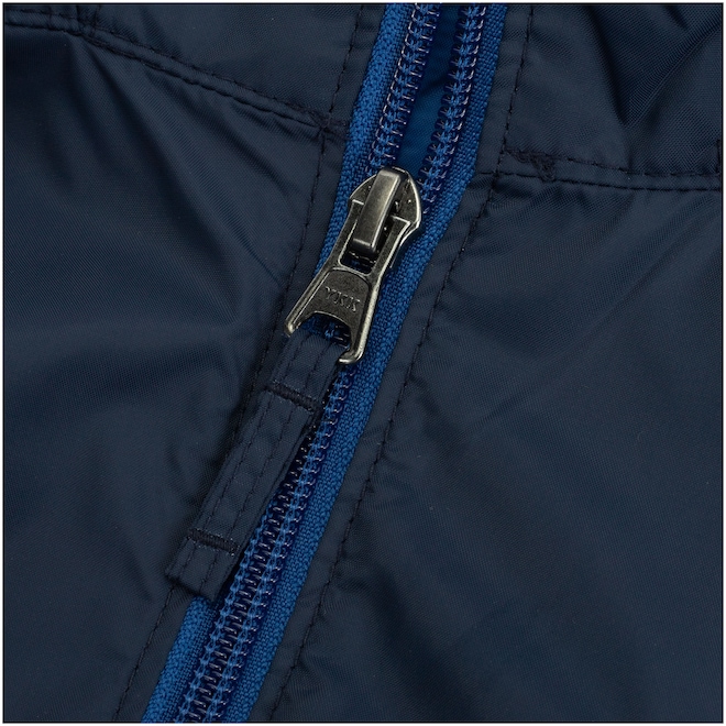 O design dobrável e portátil permite guardar a peça no próprio bolso, além de contar com capuz embutido-retrátil, bolsos com zíper e ajustes na barra e punhos.