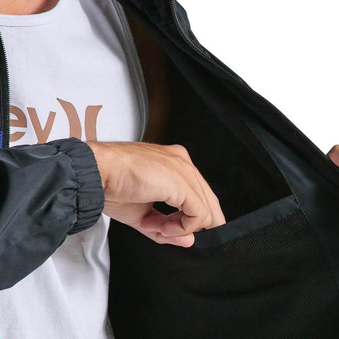 Jaqueta Hurley Windbreaker, forro em mesh, capuz com gola alta, heat transfer ONE&ONLY refletivo, recorte frente e costas e bolsos frontais selados.