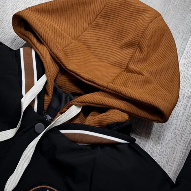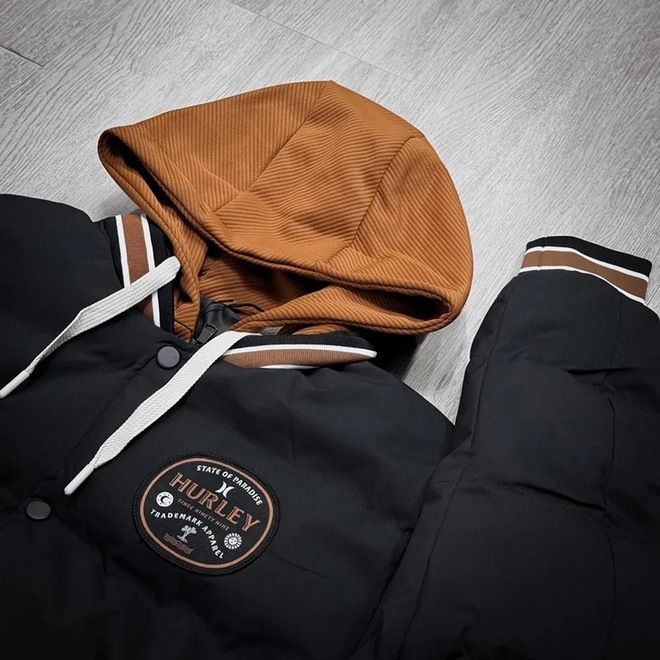 Jaqueta Hurley com forro de manta acrílica, simula 2 peças, fechamento com zíper e botões, punho e barra com listras, patch bordado e bolsos frontais.