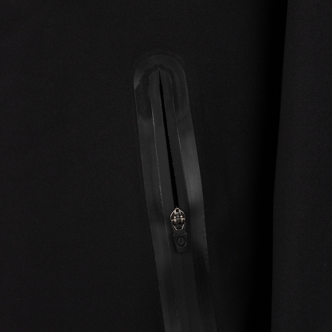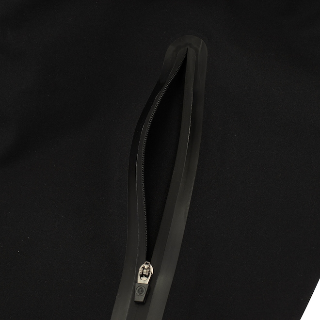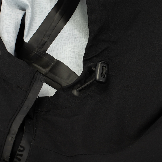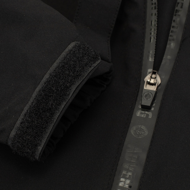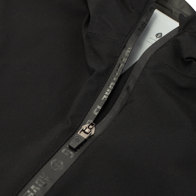 Suas costuras são seladas e o zíper do seu fechamento é personalizado. A barra traseira tem recorte arredondado e os punhos são elásticos.
