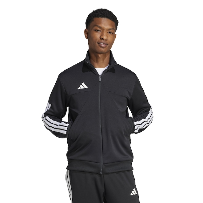 Com visual inspirado no futebol, a jaqueta Tiro adidas traz gola alta com zíper, punhos e barras caneladas para ajuste confortável e dois bolsos laterais com zíper, ideais para o dia a dia ou para o aquecimento pré-treino.