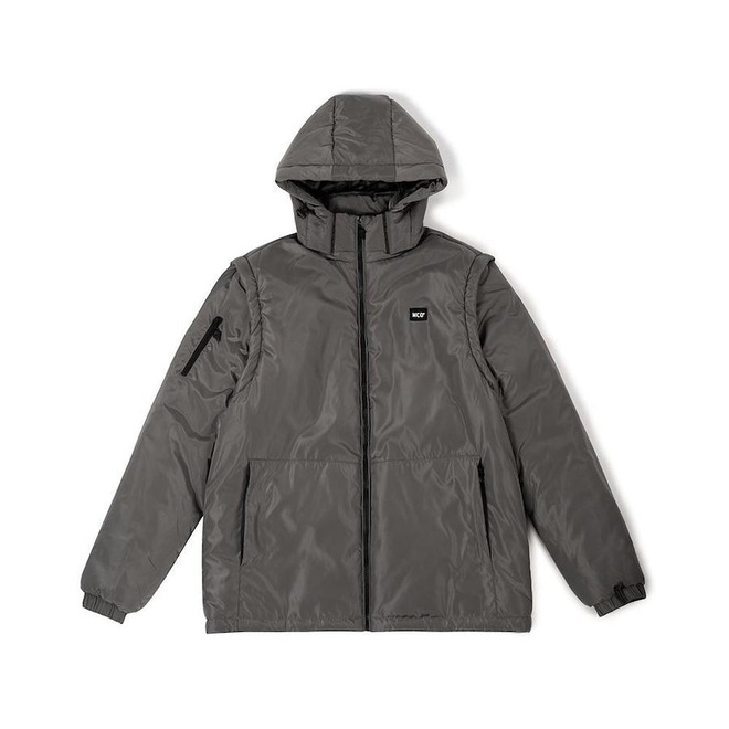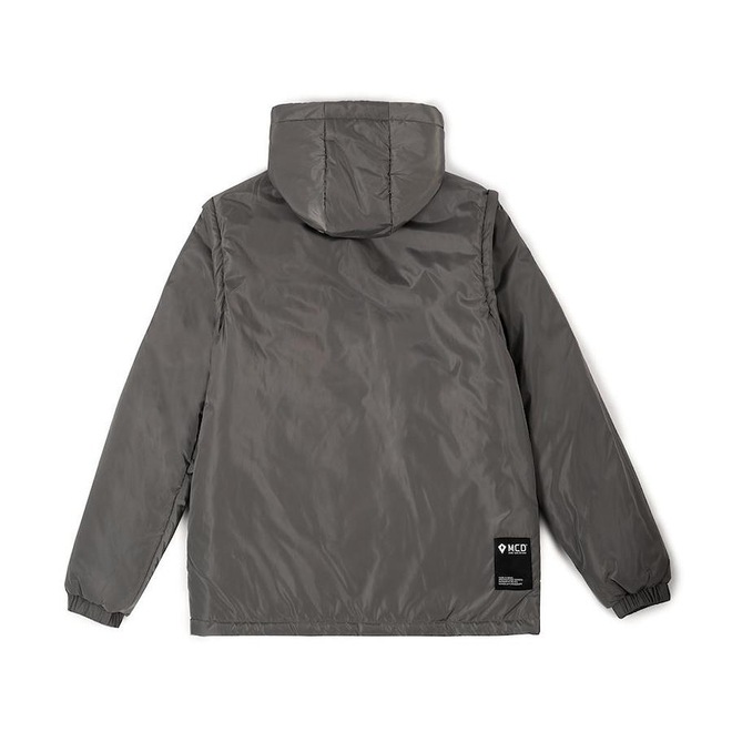 Jaqueta MCD feita em tecido microfibra, logo no peito, bolso na manga direita de quem veste, bolsos frontais e etiquetas personalizadas.