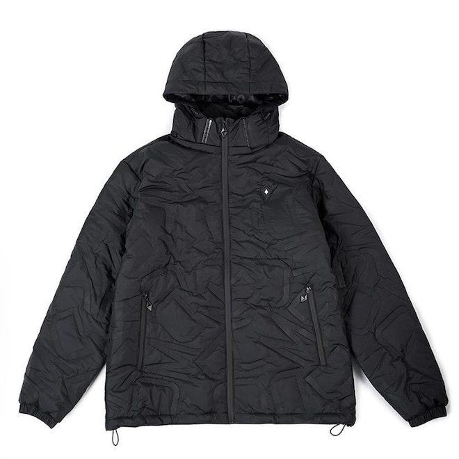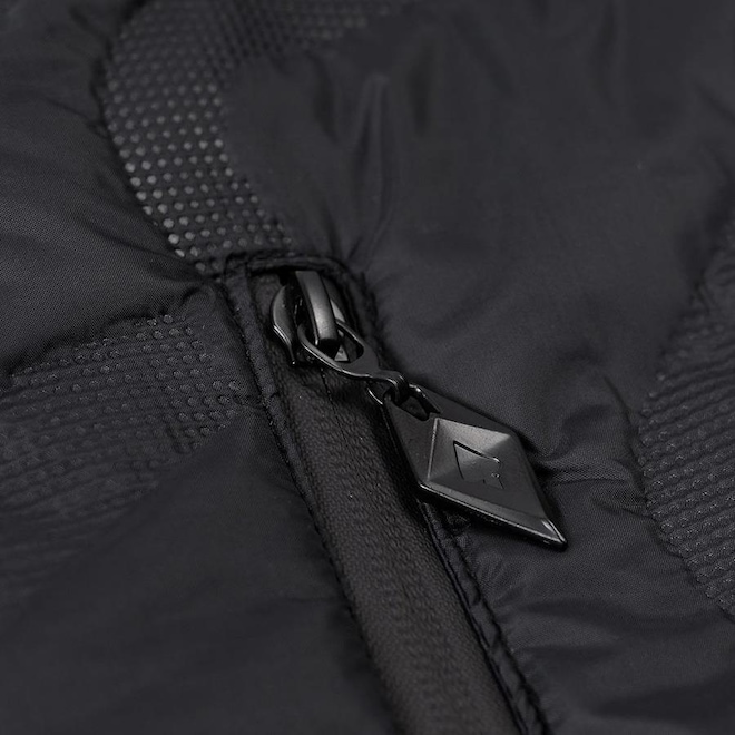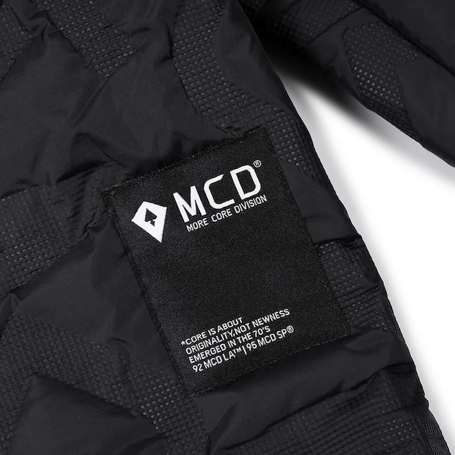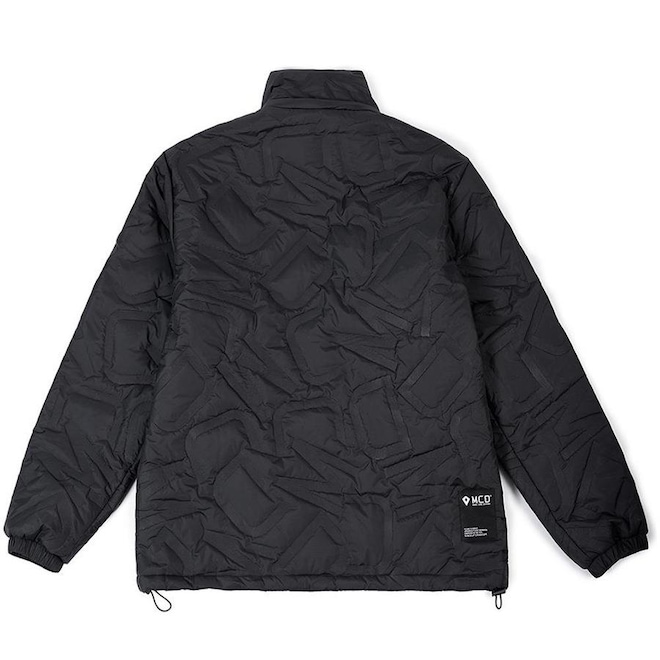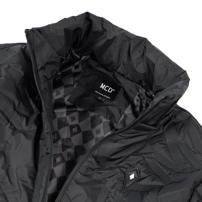 Jaqueta MCD feita em tecido microfibra, logo frontal no peito, bolso na manga direita de quem veste, bolsos frontais e etiquetas personalizadas.