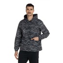 Em poliéster e forrada, possui fechamento por botões de pressão, colarinho comum e capuz embutido para mais proteção em dias frios.