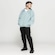 O fechamento é em zíper com gola alta e capuz embutido, fechamento por cordão, para proteção completa nos dias frios.