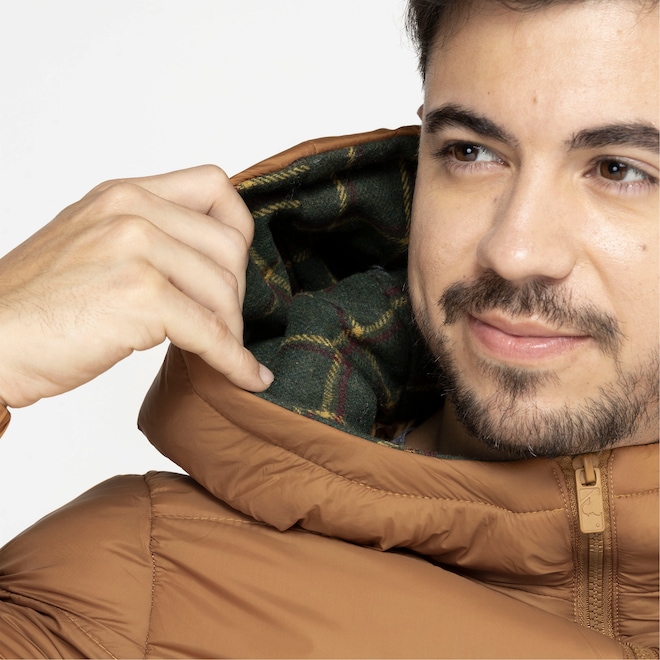 Conta com capuz, 3 bolsos sendo laterais e interno para guardar seus objetos e sua gola é alta.