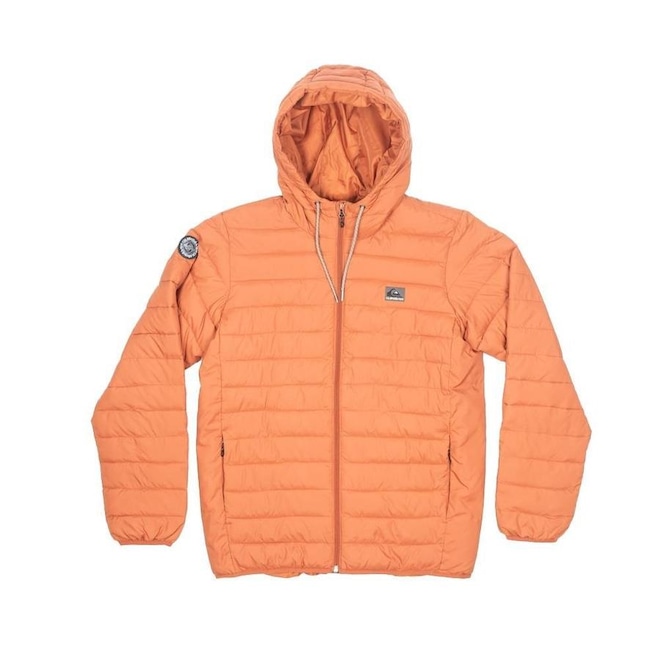 Jaqueta Quiksilver puff, modelagem regular, capuz fixo de 3 painéis, forro acolchoado e tafetá, bolsos com zíper nas laterais invisível, fechamento frontal com zíper, punho e barra elástico simples, etiqueta personalizada no peito e cordão no capuz.