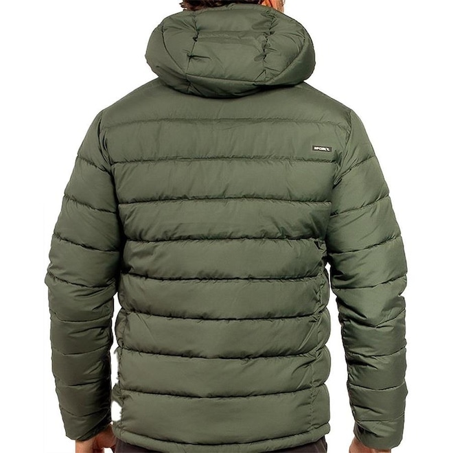 Jaqueta Rip Curl Puffer feita em pertex reciclado quantum ripstop, tratamento dwr repelente a água, etiqueta de couro, embalável no bolso interno, bolsos com fechamento em zíper, forro reciclado e modelagem regular fit.