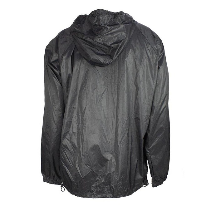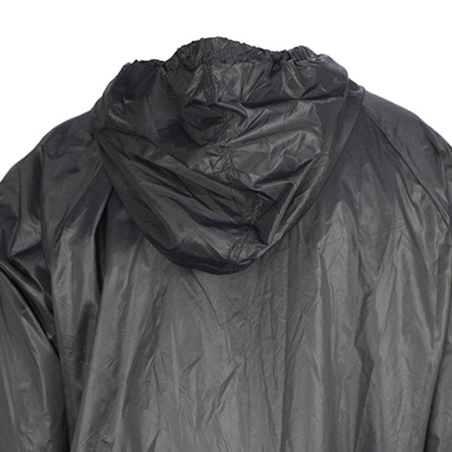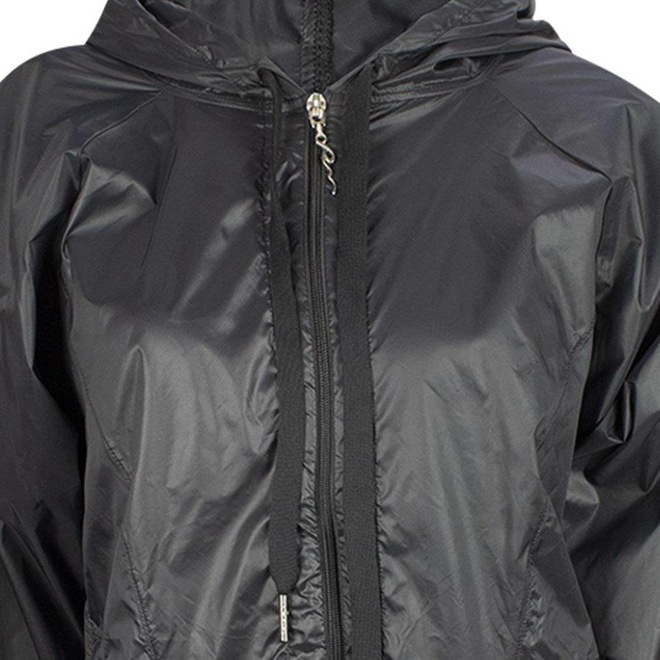 Apresenta capuz com cordão, ajuste na barra com elástico roliço e pingente plástico.