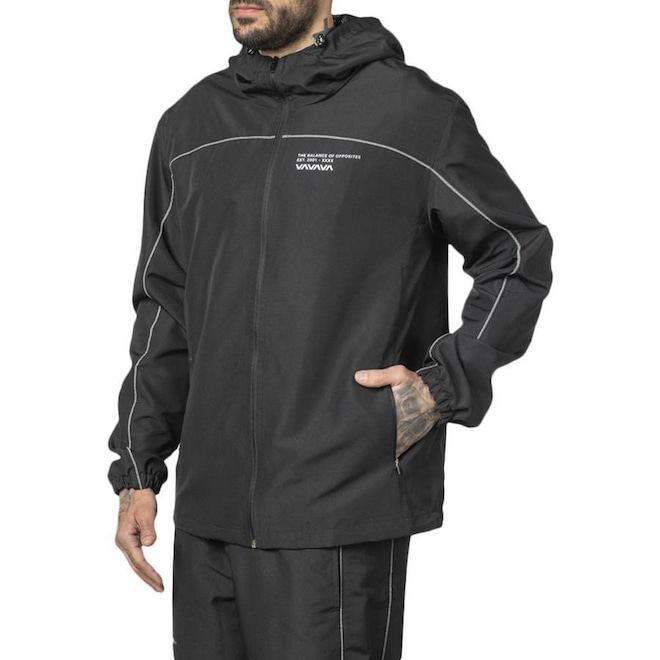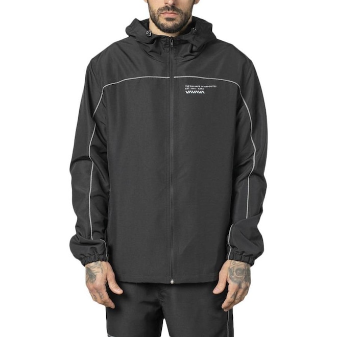 Jaqueta RVCA em tecido de nylon rip stop com forro em tecido furadinho, capuz e barra com ajustadores, vista com zíper, bolsos frente embutido com fechamento em zíper, vivo refletivo aplicado na frente, manga e costas, silk logo metalizado frente e costas e etiquetas personalizadas.
