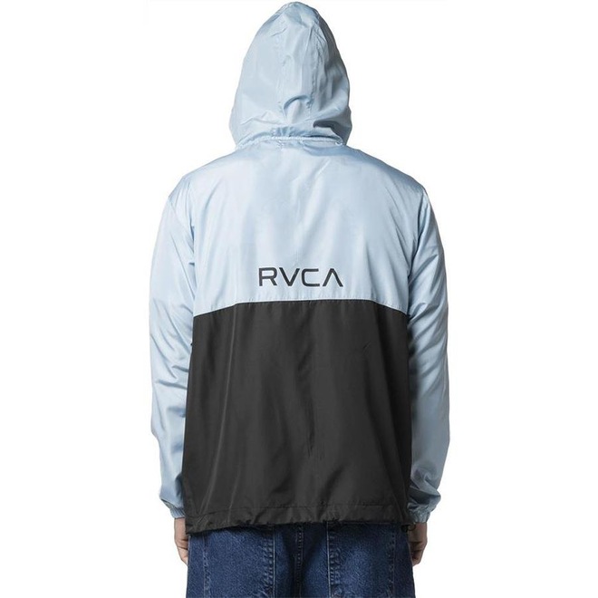 Jaqueta RVCA feita em tecido leve com repelência a água e forro do capuz em tecido furadinho, vista frente com zíper, recortes no corpo com tecidos contrastantes, estampa localizada no peito e costas, reguladores no capuz, bolsos embutidos na frente e etiquetas personalizadas.