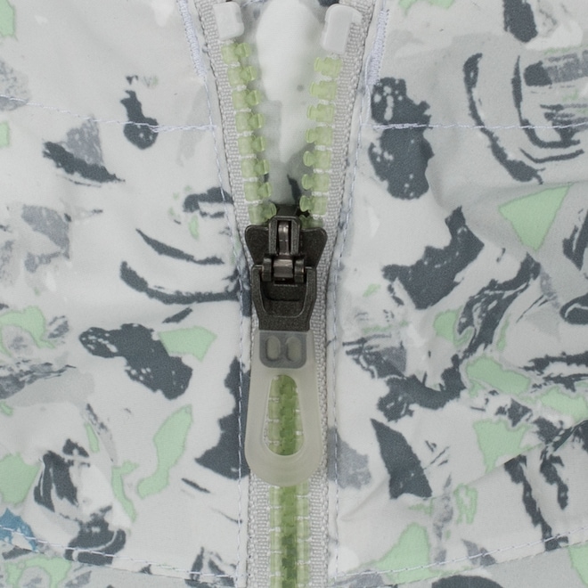 Possui fechamento em zíper, dois bolsos laterais para guardar os objetos perto das mãos e capuz e forro.