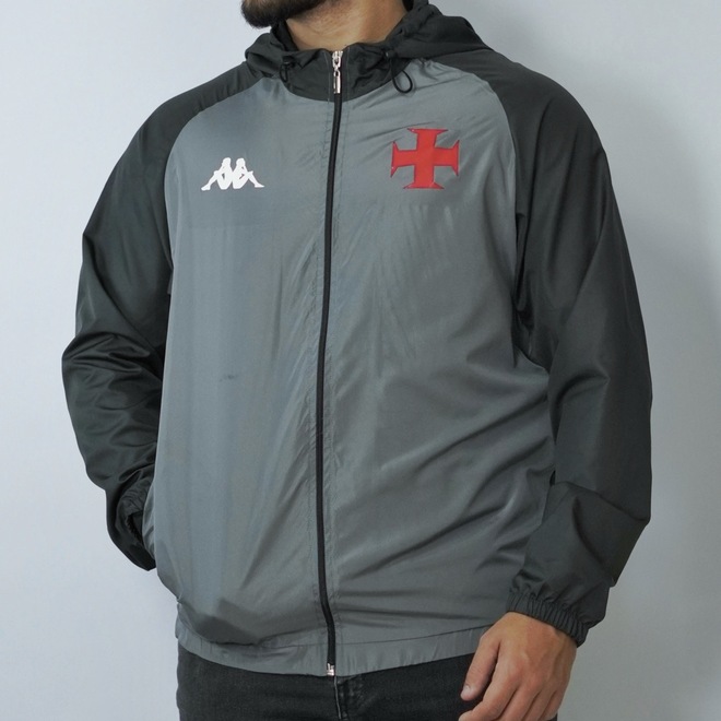 Corta vento estiloso e funcional, confeccionado em tecido 100% poliéster, ideal para proteção leve contra o vento e clima ameno. Possui design moderno em cinza com mangas e capuz pretos, destacando o escudo tradicional do Vasco da Gama estampado no peito direito e o logo da Kappa no lado esquerdo. Seu fechamento em zíper, dois bolsos nas laterais, trazendo seu punho com elástico e seu capuz com ajuste em elástico também. Um item perfeito para torcedores que querem demonstrar paixão pelo clube com conforto e atitude.