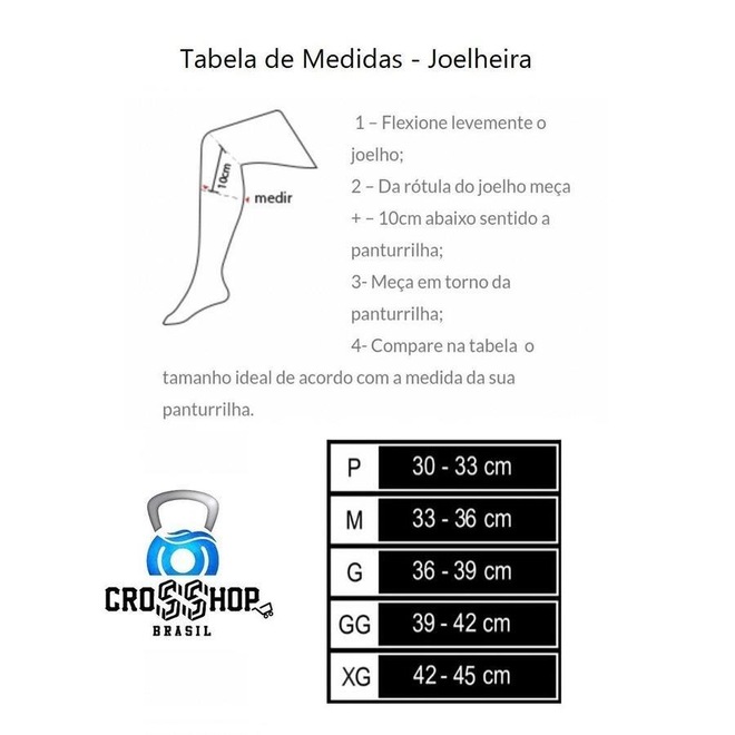 A Joelheira Performance Crosshop Brasil proporciona suporte às articulações e joelhos, otimizando a movimentação do atleta em exercícios como levantamento de peso, treinamento funcional, agachamento, afundo, cadeira extensora e legpress. Sua importância reside na capacidade de fornecer suporte e estabilidade aos joelhos, reduzindo o risco de lesões durante exercícios de alta intensidade. Além disso, a eficiência dessa joelheira está na sua capacidade de amortecer impactos e proporcionar uma melhor distribuição de carga nas articulações, permitindo uma execução mais segura e eficaz dos movimentos. Fabricada em neoprene de alta resistência, a joelheira é ideal para a prática de exercícios de força, proporcionando leve aquecimento e compressão no local, aumentando significativamente a performance do atleta. Possui design anatômico e viés de leve elasticidade, promovendo mais segurança e estabilidade durante o treino. Firme e rígida, portanto indicada para treinos de cross, WOD, musculação, levantamento de peso e exercícios com carga pesada em geral, pois garante bastante estabilidade ao joelho. COMO VESTIR FACILMENTE A JOELHEIRA NC EXTREME? - Dobre-a ao lado contrário da estampa; - Em pé ou sentado, posicione a joelheira de modo que a etiqueta fique na parte de baixo. Ainda nessa posição (ao contrário), puxe-a, até que a parte superior da joelheira encoste na parte inferior do joelho; - Desdobre a joelheira, de baixo para cima; - Ajuste-a até que fique completamente desdobrada. Pronto! Agora é só começar seu exercício! ESPECIFICAÇÕES TÉCNICAS - Neoprene 7mm; - Elástico 15mm; - Acabamento em suplex; - Longa durabilidade; - Lavável. TABELA DE MEDIDAS Obs.: Flexione levemente o joelho, da rótula do joelho meça +ou- 10cm abaixo sentido panturrilha, meça em torno da panturrilha nesse ponto. P: 30cm ? 33cm; M: 33cm ? 36cm; G: 36cm ? 39cm; GG: 39cm ? 42cm; XG: 42cm ? 45cm; Crosshop Brasil desde 2019 visando qualidade , segurança e performance de seus atletas e clientes.ref: M0ZSVI