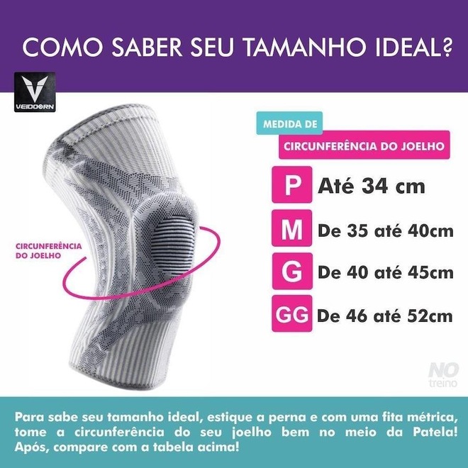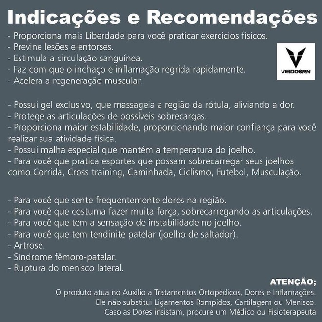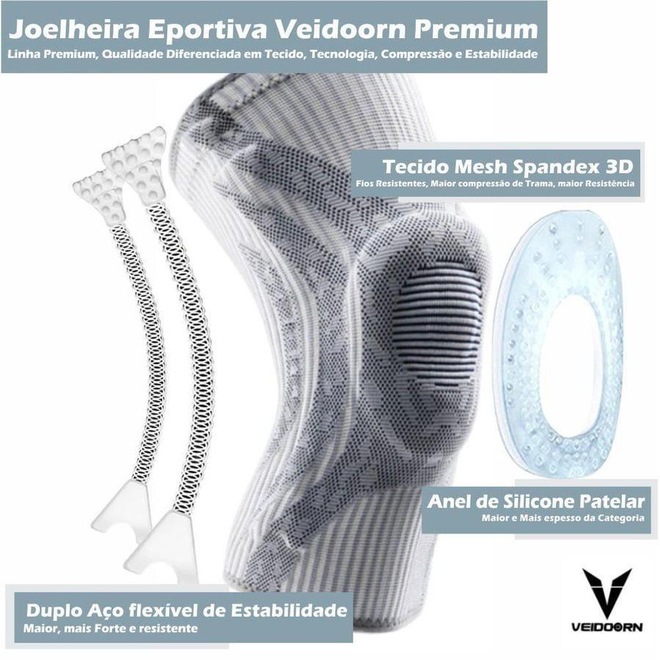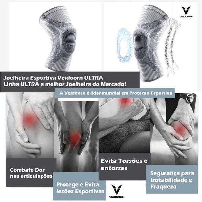 Joelheira Veidoorn Ultra Tricô Pad Silicone e Aço Flexível INOVADOR SISTEMA COM 3 PONTOS CHAVES 1) TECIDO MESH KNIT 3D - Compressão, Flexibilidade e Aquecimento na medida certa com seu revolucionário Tecido Mesh Spandex 3d sem costuras Linha ULTRA com fios em Tramas Mais forte, resistente e respirável sem odores. Produto Não Deforma. Não tenha contato do produto com superfícies Abrasivas 2) ANEL PATELAR DE SILICONE - Estabilidade Patelar, efeito massageador na região da patela, proteção contra impactos e batidas Linha ULTRA, maior e mais espesso anel patelar da Categoria 3) DUPLO AÇO ESPIRAL FLEXÍVEL DE ESTABILIDADE EM LINHA COM O LIGAMENTO LATERAL - Em linha com os ligamentos Laterais, os espirais de Aço flexível proporcionam perfeita estabilidade, suporte e segurança para movimentos giratórios e em linha reta Na linha ULTRA os Espirais de Aço são maiores, com maior Rigidez e sem perda da perfeita Flexibilidade DESCRIÇÃO DO PRODUTO - - Modelo ULTRA se diferencia pela Alta qualidade em relação a concorrência - Marca Veiddorn, referencia mundial em proteção esportiva - Venda em unidade = 1 unidade - Não Tem lado, serve para o joelho direito ou esquerdo - Atenção Produto delicado, não ter contato com superfícies abrasivas TABELA DE MEDIDAS - P - circunferência de patela até 34 cm M - circunferência de patela: 35 - 40 cm G - circunferência de patela: 40 - 45 cm GG - circunferência de patela acima de 46 cm Estique a perna e pegue a circunferência do seu joelho na altura da patela (centro do joelho), compare com o Guia de medidas acima acima. INFORMAÇÕES ADICIONAIS - - Compressão com Tricô 3D, material inovador, uma trama de Spandex com Nylon - o Spandex com o Nylon proporcionam compressão e leve aquecimento, gerando aumento de fluxo sanguíneo na região - Anel Frontal de Silicone Flexível - proporciona ação massageadora e proteção patelar - Anti impacto - Fio espiral de Aço Flexível nas 2 laterais - proporciona estabilidade nas duas laterais sem perda de flexibilidade INDICAÇÕES E RECOMENDAÇÕES - - Proporciona mais Liberdade para você praticar exercícios físicos. - Previne lesões e entorses. - Estimula a circulação sanguínea. - Faz com que o inchaço e inflamação regrida rapidamente. - Acelera a regeneração muscular. - Possui gel exclusivo, que massageia a região da rótula, aliviando a dor. - Protege as articulações de possíveis sobrecargas. - Proporciona maior estabilidade, proporcionando maior confiança para você realizar sua atividade física. - Possui malha especial que mantém a temperatura do joelho. - Para você que pratica esportes que possam sobrecarregar seus joelhos como Corrida, Cross training, Caminhada, Ciclismo, Futebol, Musculação. - Para você que sente frequentemente dores na região. - Para você que costuma fazer muita força, sobrecarregando as articulações. - Para você que tem a sensação de instabilidade no joelho. - Para você que tem tendinite patelar (joelho de saltador). - Artrose. - Síndrome fêmoro-patelar. - Ruptura do menisco lateral.ref: M0X3O6