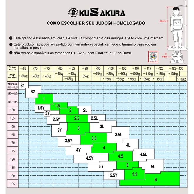 Logotipo vermelho da KuSakura na parte inferior da perna da calça esquerda.Como escolher o tamanho ideal: