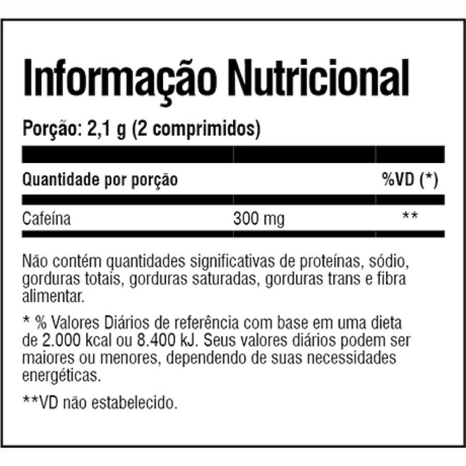 ""Este produto não deve ser consumido por gestantes, lactantes e crianças"" Ingredientes: Cafeína, aromatizantes naturais (extratos secos de Citrus aurantium, Chá e Gengibre), antiumectantes (Carbonato de cálcio e Dióxido de silício), veículo Maltodextrina, estabilizante Croscarmelose, lubrificante Estearato de magnésio, emulsificante Hidroxipropilmetilcelulose, corantes artificiais (dióxido de titânio e tartrazina) e espessante Talco, veículo polietilenoglicol.