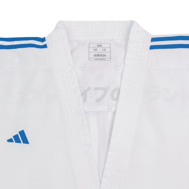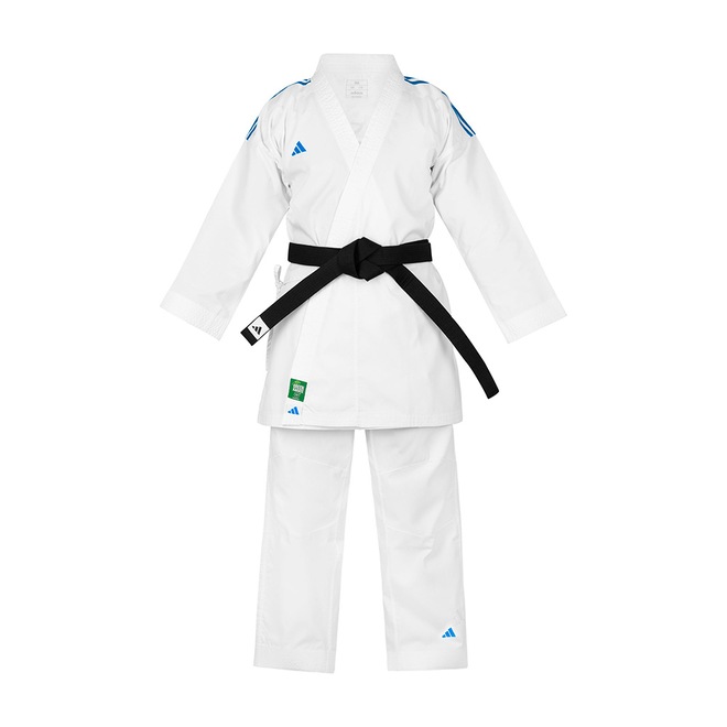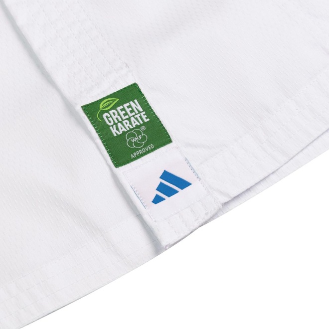Mistura de tecido 65% poliéster e 35% algodão branco brilhante 'olho de pássaro' pesando 170 grs/m 2 +/-5 gr, o tecido de secagem rápida proporciona ventilação, regulação de temperatura e encolhimento mínimo. Calças com reforço em todo o comprimento, cintura elástica e tradicional cordão para melhor fechamento. Forro interno sublimado nas costas na parte interna e superior da jaqueta. Decoração oficial da WKF com logotipo bordado no peito, nas costas da jaqueta e calça.