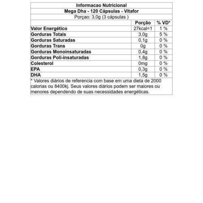 Ingredientes - Mega Dha - 120 Cápsulas - VitaforÓleo de Peixe (Ômega 3) CONTÉM PEIXE.