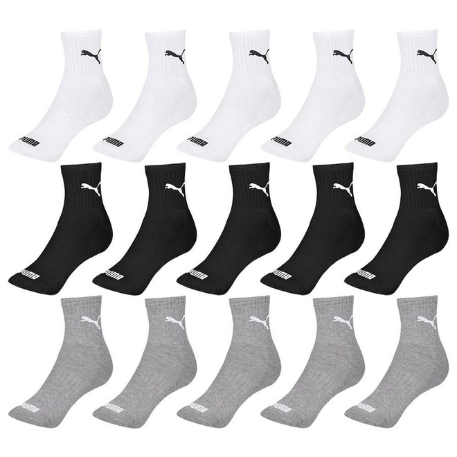 Com o Kit 15 Pares de Meia Cano Médio Puma Esportiva, você garante o conforto durante os treinos e práticas de atividades físicas. Desenvolvida com a leveza do algodão e elasticidade da poliamida, as peças possuem toque macio, reforço no calcanhar e na ponta, oferecendo alta durabilidade e melhor ventilação. Traz logo da marca em contraste no tornozelo, e elástico central para ajuste perfeito aos pés. Medidas aproximadas cm: 34-39: 17x11 (Comprimento do Pé x Largura).