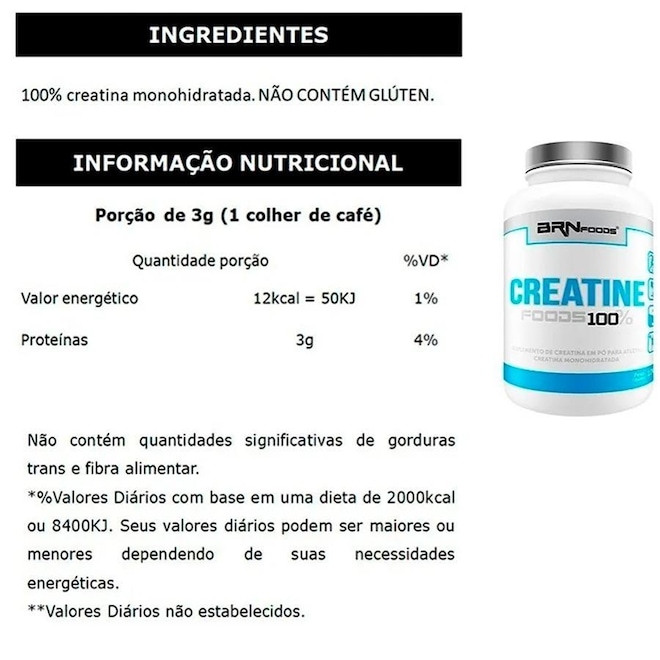 CREATINA é usada pelo tecido muscular para a produção de fosfocreatina, fator importante na formação de adenosina trifosfato (ATP), que funciona como um repositor de energia.NÃO CONTÉM GLÚTEN.