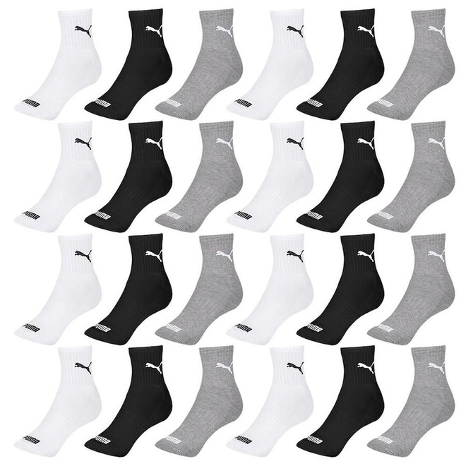 Com o Kit 24 Pares de Meia Cano Médio Puma Esportiva, você garante o conforto durante os treinos e práticas de atividades físicas. Desenvolvida com a leveza do algodão e elasticidade da poliamida, as peças possuem toque macio, reforço no calcanhar e na ponta, oferecendo alta durabilidade e melhor ventilação. Traz logo da marca em contraste no tornozelo, e elástico central para ajuste perfeito aos pés. Medidas aproximadas cm: 34-39: 17x11 (Comprimento do Pé x Largura).