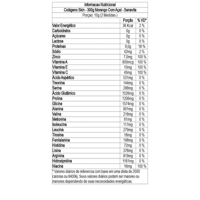 Ingredientes - Colágeno Skin - 300g Morango Com Açaí - Sanavita