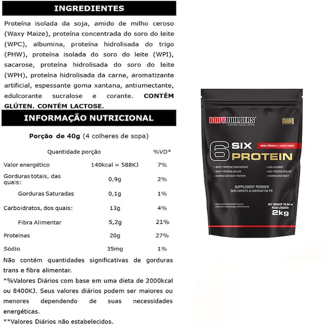 6 Six Protein Bodybuilders BODYBUILDERS: é composta por 6 PROTEÍNAS combinadas, cada uma com diferentes perfis de aminoácidos.Sua fórmula garante absorção da proteína por um tempo prolongado e é a solução ideal para as necessidades de proteína de qualquer indivíduo.