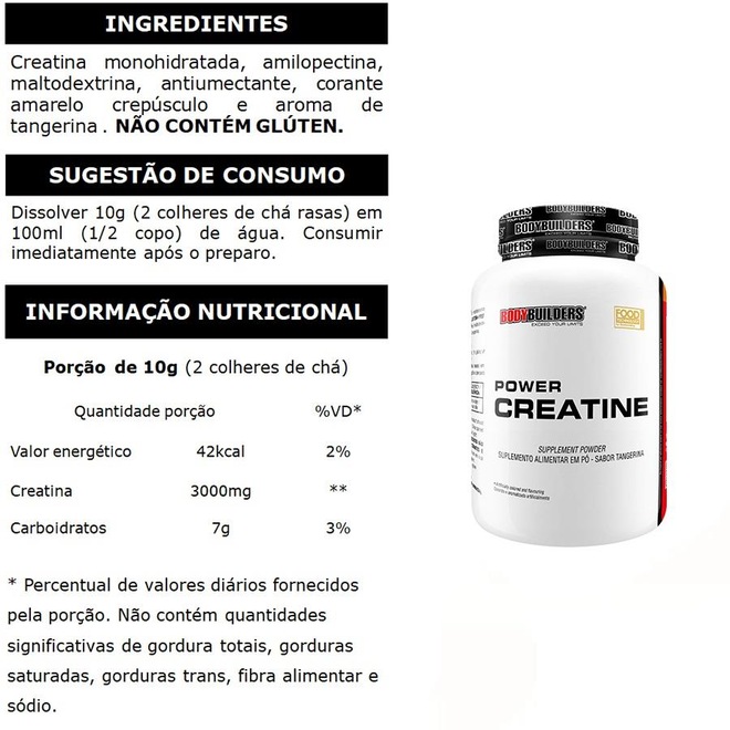 100% CREATINE BODYBUILDERS: É usada pelo tecido muscular para a produção de fosfocreatina, fator importante na formação de adenosina trifosfato (ATP), que funciona como um repositor de energia.Recomenda-se a ingestão com água, ou conforme orientação de um médico ou nutricionista.
