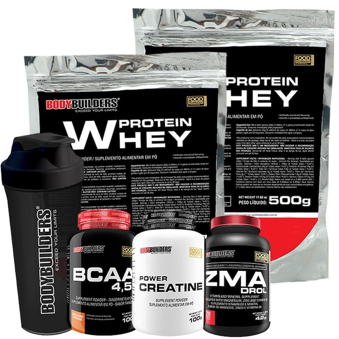 Composição do Kit: 2x Whey Protein: Refil de 500g 1x BCAA 4.5: Pote de 100g 1x Creatina: Pote de 100g 1x ZMA Droll: Pote de 120 cápsulas 1x Coqueteleira 600ml WHEY PROTEIN é um alimento em pó balanceado, à base de Proteina Concentrada do Soro do Leite (WPC), rica em aminoácidos essenciais de rápida absorção. Whey Protein, sendo uma proteína de alto valor biológico (HBV) complementa a dieta diária e promove a manutenção da massa magra e a saúde geral do organismo. BCAA é indicado para ser ingerido antes e após o treino, pois fornece energia e retarda a fadiga central. Estimula a síntese de proteína muscular recuperando imediatamente os músculos danificados e prevenindo dores. A suplementação com BCAA está entre as mais importantes para qualquer programa nutricional esportivo, pois eles são indispensáveis para a manutenção e crescimento dos músculos. CREATINA é proveniente de um composto produzido naturalmente pelo organismo, a creatina é formada a partir da associação de 3 aminoácidos de alto valor biológico: arginina, glicina e metionina. A 100% CREATINE é usada pelo tecido muscular para a produção de fosfocreatina, fator importante na formação de adenosina trifosfato (ATP), que funciona como um repositor de energia. Recomenda-se a ingestão com água, ou conforme orientação de um médico ou nutricionista. Pode-se adicionar algum carboidrato, como maltodextrina ou sacarose na água, para facilitar seu transporte para dentro da célula muscular. ZMA DROL é um suplemento vitamínico e mineral à base de magnésio, zinco e vitamina B6. Contém formas exclusivas e fórmula revolucionária que combina concentrações específicas dessas substâncias, as quais ajudam a aumentar os hormônios anabólicos, recuperação, cicatrização, manutenção de tecidos, crescimento muscular e força. Por causa da eficácia no aumento dos níveis de testosterona, esse suplemento é utilizado por milhares de atletas em todo mundo como uma alternativa segura e natural de pró-hormônios. COQUETELEIRA fabricada em material plástico resistente com capacidade de 600ml. A cor varia de acordo com a disponibilidade em estoque. SUGESTÃO DE CONSUMO: a) Whey Protein: Consumir 1 porção de 50g (5 colheres de sopa rasa) diluido em 300ml (1 1/2 copo) de água gelada, logo após a atividade física. Consumir imediatamente após o preparo. b) BCAA: Sugere-se 1 porção de 5g (1 colher de chá) diluída em 200ml (1 copo) de água. c) Creatina: Dissolver 6g (2 colheres de café) em 100ml (1/2 copo) de água. Recomenda-se a ingestão de 1 porção ao dia. d) ZMA: Ingerir 2 cápsulas ao dia (1x ao dia). IMPORTANTE a) Validade dos produtos: de 18 a 24 meses b) Vendemos somente produtos originais e devidamente lacradosref: M0ECC4