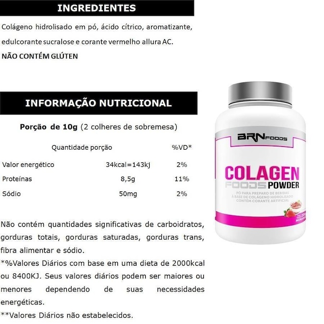 d) Colágeno: Ingerir de 2 a 3 cápsulas 2 vezes ao dia junto às refeições ou conforme recomendação de um médico e/ou nutricionista.
