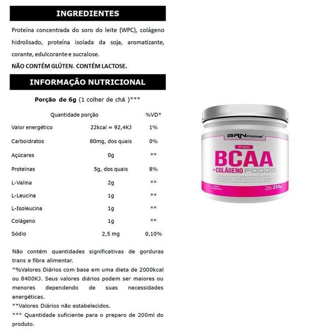 b) Pink BCAA + Colágeno: Sugere-se uma porção ao dia de 5g (1 colher de chá) diluída em 200ml (1 copo) de água.