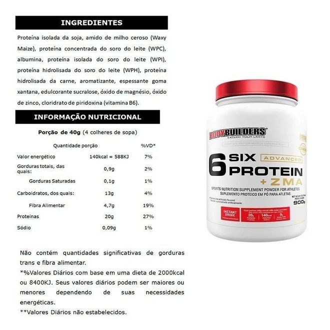 6 SIX PROTEIN BODYBUILDERS ADVANCED + ZMA é um blend proteico fabricado com 6 tipos de proteínas de alto valor biológico proporcionando assim os aminoácidos necessários para uma dieta completa e equilibrada.Sua nova fórmula contem ZMA, suplemento vitamínico e mineral à base de magnésio, zinco e vitamina B6.