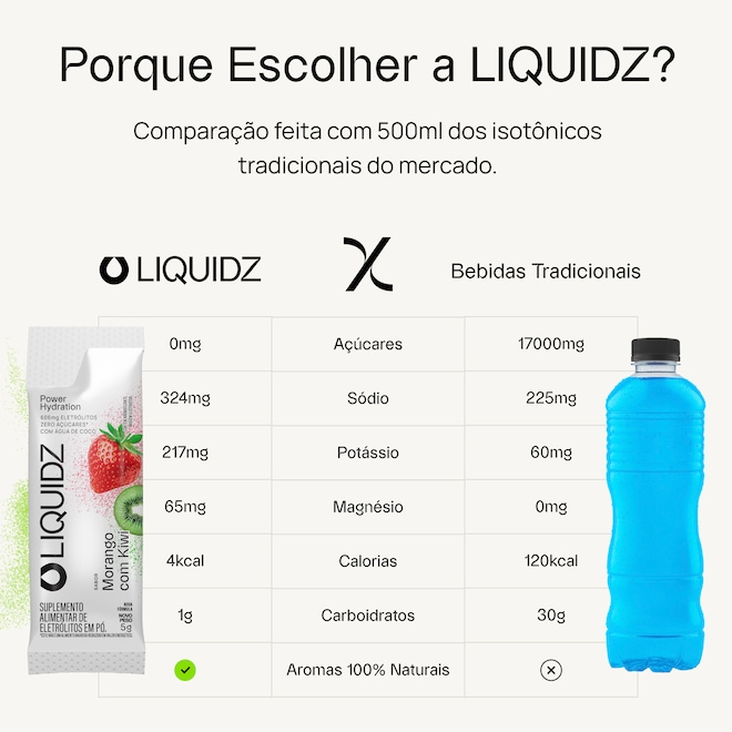 LIQUIDZ é uma solução de hidratação que combina os principais eletrólitos essenciais como sódio, potássio e magnésio. Esses minerais são fundamentais para manter a hidratação adequada, melhorar a função muscular e nervosa, e equilibrar o pH do corpo. LIQUIDZ é formulado para ser consumido diariamente, especialmente ao acordar, durante e após atividades físicas, para garantir uma hidratação eficiente e rápida.