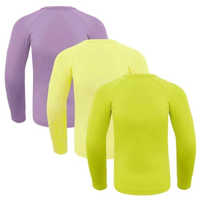 Com o Kit 3 camisas térmicas Selene Proteção UV Manga Longa Juvenil os pequenos jovens poderão se divertir com maior segurança durante os dias de sol. Sendo fabricada em 80% Poliamida e 20% Elastano, o modelo apresenta maior elasticidade, garantindo um ótimo caimento ao corpo. Conta com mangas longas, maximizando a proteção contra os raios solares. A gola é do tipo redonda, fornecendo um visual mais limpo e confortável para seu uso. Além de garantir proteção térmica, a peça apresenta proteção UV50+, que te protege dos raios UV-A e UV-B, criando uma camada de proteção para sua pele. Cada peça tem cor única, garantindo conforto e estilo para as brincadeiras em dias de verão. Medidas aproximadas (cm): 8-32x44x32 /10-34x46x34 / 12-36x48x36 / 14-38x50x38 / 16-40x52x40 (Largura x Comprimento x Manga).