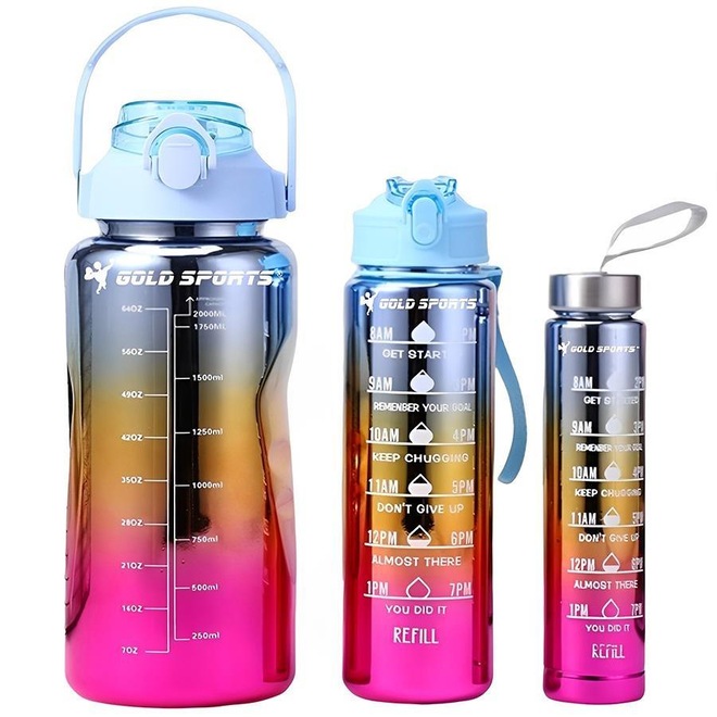 Kit 3 Garrafas Squeeze Plástica Gold Sports Degrade Adesivos Bpa-Free 2 Lts, 800ml e 280ml