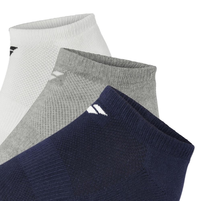 - Detalhamento: Embalagem com 3 pares de meias nas cores Branco Azul e Cinza, com cano invisível e logo da marca no topo do dorso. Veste do 35 ao 38. Oferece ótimo suporte, enquanto o calcanhar e o solado são acolchoados para garantir conforto e proteção durante o uso. A parte superior do pé (dorso) conta com tecido respirável, promovendo ventilação e mantendo os pés secos por mais tempo. Ideal para treinos ou uso diário.