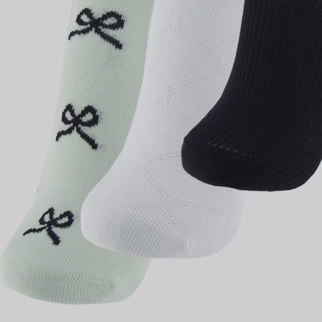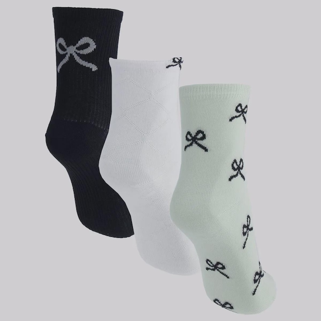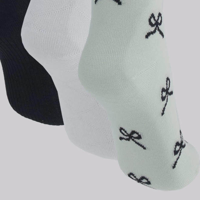 Composição meia verde: 58% Algodão, 38% Poliamida, 03% Elastano e 01% Outra fibra Composição outras: 66% Algodão, 30% Poliamida, 03% Elastano e 01% Outra fibra Contém: 01 par na cor preto, 01 par na cor branca e 01 par na cor verde Origem: Nacional Gênero: Feminina Cano: Médio Tamanho único: 34-39