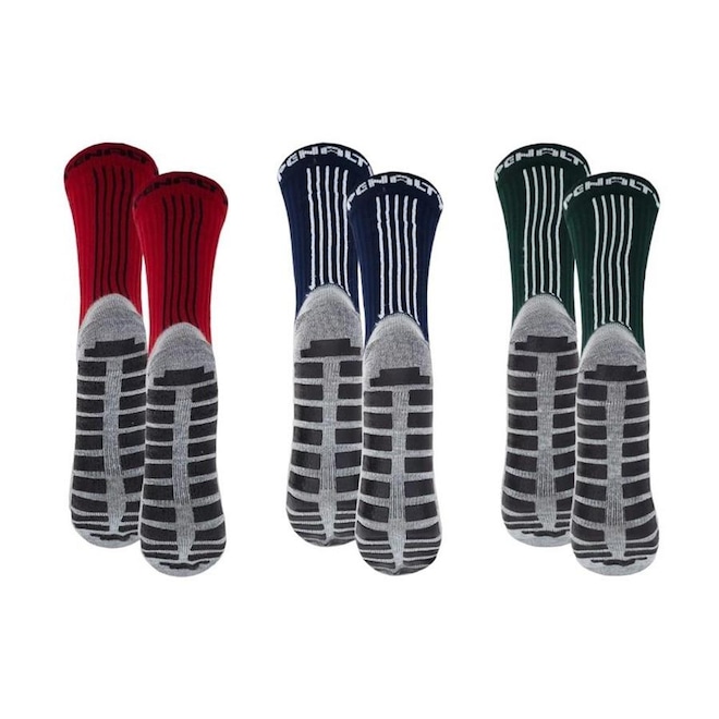 O Kit 3 Pares de Meias Penalty Grip Masculina é perfeito para quem busca conforto e desempenho nos jogos de futebol.Ameia deste kitt foi confeccionada com uma composição de poliéster e poliamida, ela é resistente e durável, garantindo uma alta perf