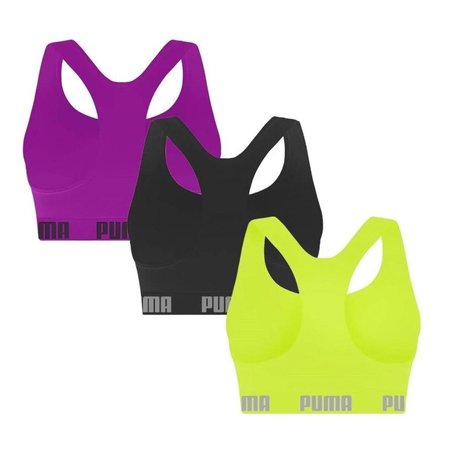 - Sobre o produto - Kit Top Puma Nadador Sem Costura - Feminino - 3 UnidadesO Kit 3 Tops Puma Nadador Sem Costura é ideal para usar por baixo de regatas para treinos e dia a dia.- Confeccionado em tecido super leve e macio, o modelo traz acabamento canelado com estampas da marca na barra, dando maior segurança. - Conta com alça grossa, decote em U, e costas com modelagem nadador. - Medidas aproximadas (cm): P-30x12/M-32x14/G-34x16/EG-36x18 (largura x comprimento do busto).
