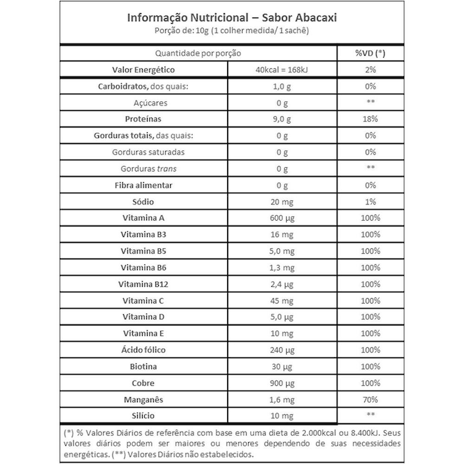Peptídeo de colágeno, premix de vitaminas e minerais [ácido ascórbico (vitamina C), nicotinamida (vitamina B3), acetato de DL-alfa-tocoferol (vitamina E), D-pantotenato de cálcio (vitamina B5), sulfato de manganês (manganês), cloridrato de piridoxina (vitamina B6), sulfato cúprico (cobre), acetato de retinol (vitamina A), ácido fólico (vitamina B9), D-biotina (vitamina H), colecalciferol (vitamina D) e cianocobalamina (vitamina B12)], ácido ortosilícico estabilizado em cloreto de colina (silício), aroma idêntico ao natural de abacaxi, acidulante ácido cítrico, espessante goma xantana, edulcorantes glicosídeos de esteviol (estévia) e taumatina e antiumectante dióxido de silício.