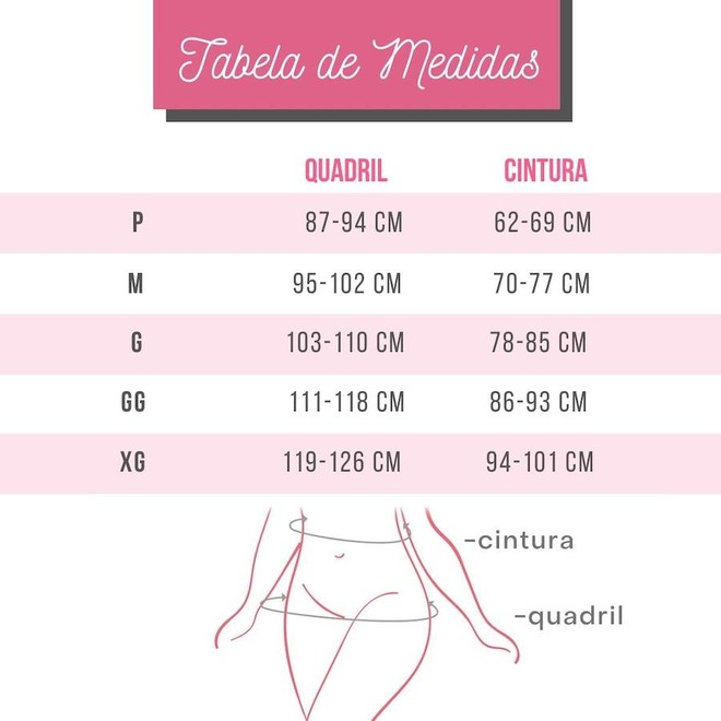 Na modelagem dessa calcinha, o P é indicado para quem veste Jeans 36, o M para 38-40, o G para 40-42, GG 42-44 e XG 44-46.